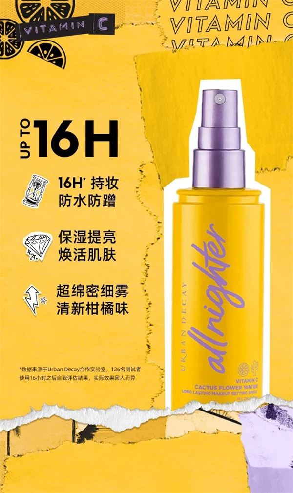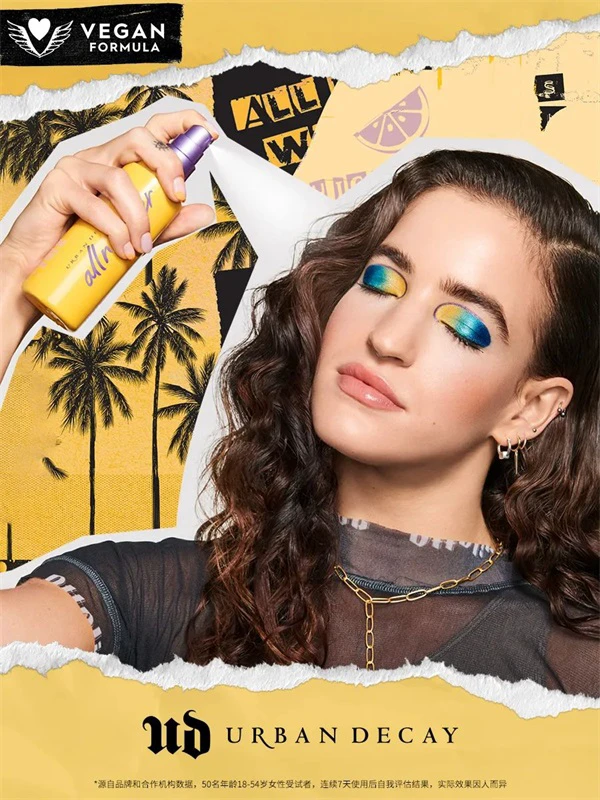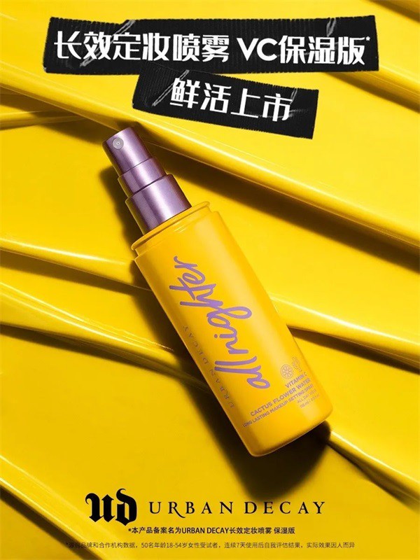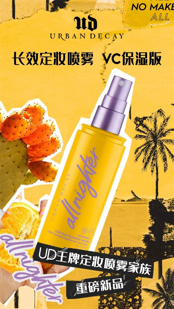 潮流彩妆品牌Urban Decay衰败城市于今夏迎来王牌长效定妆喷雾系列新成员——All Nighter长效定妆喷雾VC保湿版。作为定妆市场上“元老级”明星产品All Nighter长效定妆喷雾系列的新成员,VC保湿版“保鲜大橘喷”在延续长效持妆基础上重重升级,加入特研维C配方,为肌肤锁色驻鲜,焕发“C位”活力,保持妆容鲜活如初。