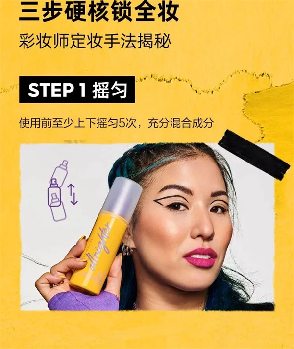 “保鲜大橘喷”在使用时,只需多次上下摇匀,在一臂距离喷洒全脸三到五次后,等待风干成膜。简单三步硬核锁全妆,获取16H鲜活妆容体验。