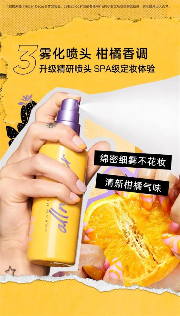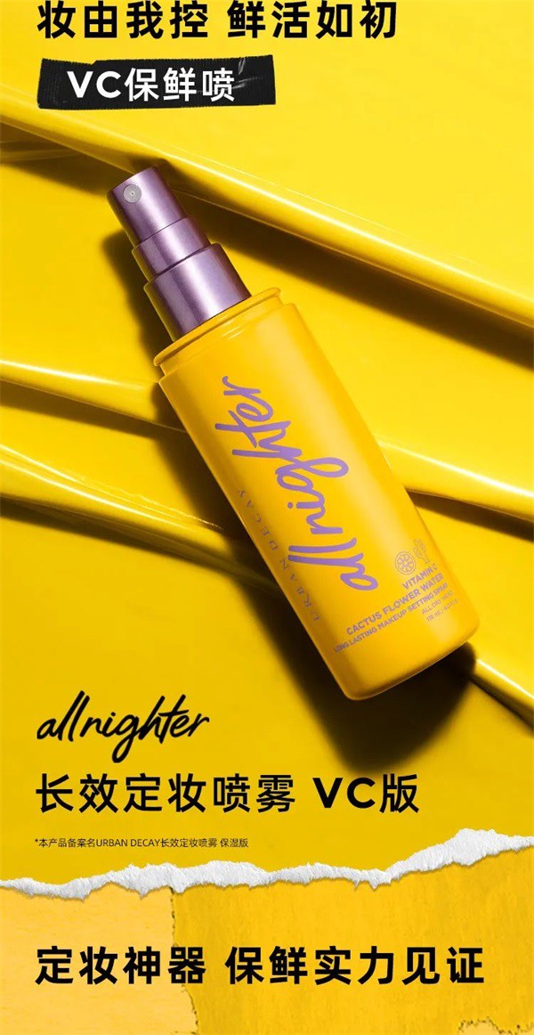 身为定妆喷雾领域的开山鼻祖,Urban Decay All Nighter长效定妆喷雾系列早已凭借其强大硬核定妆实力火爆12年之久,一度风靡Instagram等海外社交平台。随品牌入驻国内平台后,All Nighter长效定妆喷雾系列更是备受无数美妆爱好者的青睐与追捧,为中国消费者带来前所未有的革新定妆体验和源源不断的面容自信。All Nighter长效定妆喷雾系列的经久不衰除了不可撼动的定妆实力,更离不开量肤定制般的多样版本:牢锁妆容并塑造自然妆效的经典版、如液体吸油纸般的哑光版、以及专为中性至干性肌肤设置的光泽版,都满足了各类美妆爱好者的不同需求,实现妆效自由。而全新“C位”出道的VC保湿版“保鲜大橘喷”更是重量级选手,延续了Urban Decay一贯坚持的纯素配方,不但能满足混合肌肤,尤其是干性肌肤的定妆需求,还精准洞察消费者对于定妆喷雾类产品“持久”与“保湿”的两大核心需求,以VC提升妆容抗氧化性,注入活力保鲜养护,打造专属透光妆效,一年四季纵享愉悦定妆。