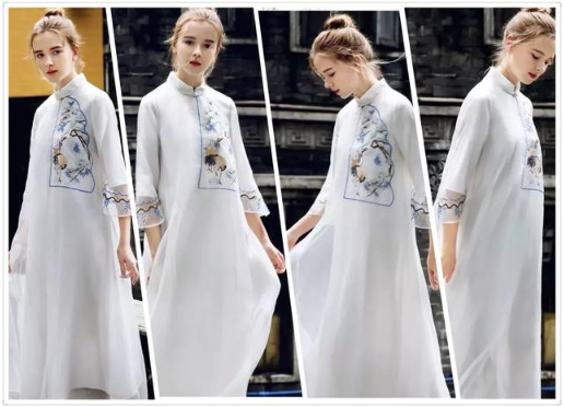 这款白色的真丝连衣裙,前胸与袖口具有中国分的图案设计,让整件裙子非常的有东方韵味。立领设计非常复古,飘逸的裙摆,仙气十足。但是整件真丝,尤其是桑蚕丝的裙子价格都比较贵,参考价都在800-1000+元。