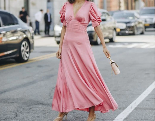 粉粉嫩嫩的颜色,最是少女心了。如果是一个甜美的姑娘,当然可以大胆的选择这种稚嫩又清新的粉色系了。浅粉色甜美大方,真丝的面料更是轻盈柔和。这种自然的V领加上修身的上身元素,更是勾勒出高挑的腰身,窈窕的身段令人着迷。泡泡袖的风格,也是洋气而大方。点缀了大波浪的裙摆,也是呈现出高级时髦的气质。