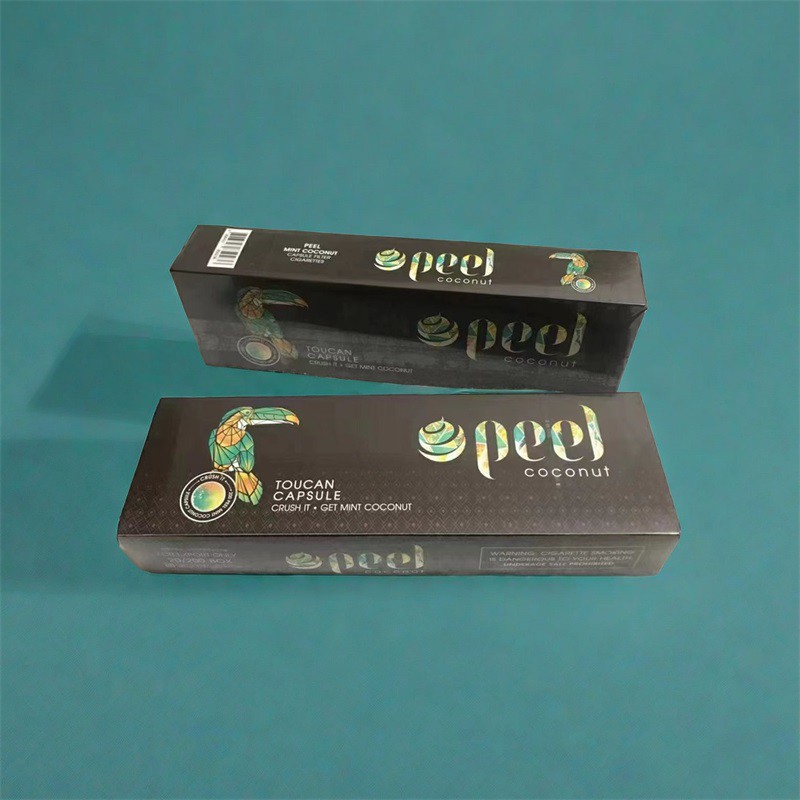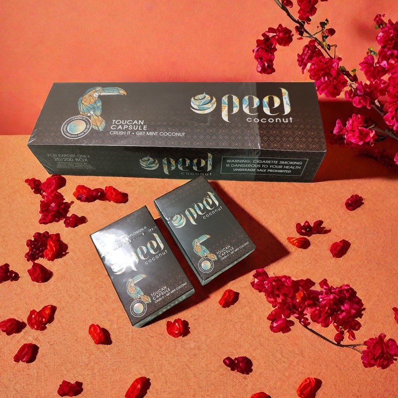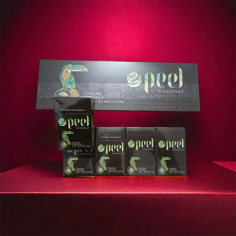 正品代购韩国混合型香烟品牌百乐peel椰子味爆珠外包装是传统的动物图案,爆珠标识有凸出感,乌鸦的图案水印,包装上的“toucan”准确的应该是“鵎鵼”,这两个字有边读边应该没错,简单说就是巨嘴鸟,字母标识“coconut”,字面就是椰子,双色几何乌鸦站在爆珠标识上显得格外警觉。百乐peel椰子正品代购多少钱一包,购买的渠道和方式如何并不是我们今天讨论的内容,那么还是尝尝味道怎么样,各方面的数据如何吧。