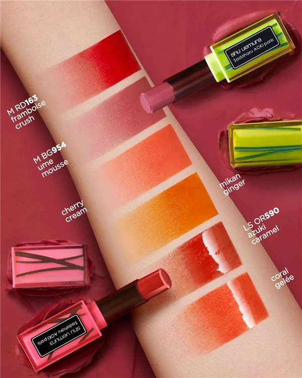 植村秀特别为这迷人的限量系列设计出6支唇膏,包含4色绿管/抹茶香气的粉雾保湿质地唇膏,以及2色粉红管/红豆甜香的聚光丰润质地唇膏。灵感源自青木定治精致法式甜点中常见的甜美素材,包括:红豆、樱桃、莓果、甜橙…等,让唇瓣呈现精品甜点后的甜蜜色泽,透出令人迷恋的红润。