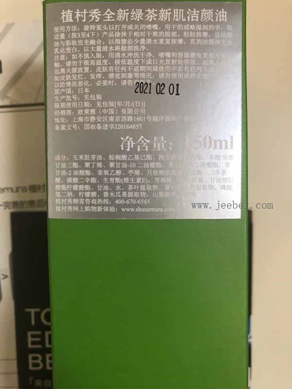 卸妆油背面,有产品使用介绍,发现这款植村秀绿茶洁颜油可以干湿两用哎!很少见卸妆产品可以湿用的!瓶口设计很棒!不用就旋转到close避免跟空气接触!出去旅游之类的也很方便携带!