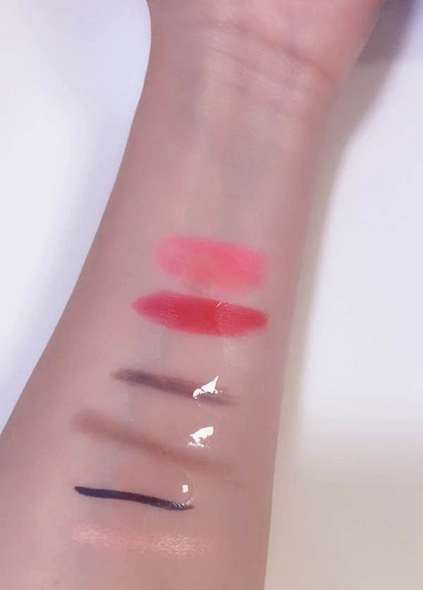 做了卸妆效果的对比,从上至下的彩妆分别是植村秀家的腮红,两只口红,还有眉笔。