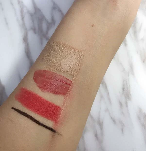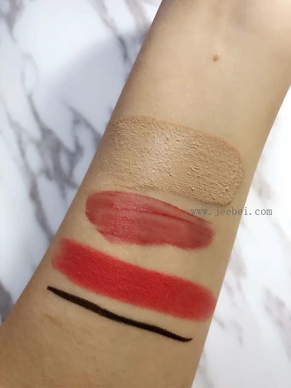 泵头的细节设计很贴心外包装盒可能不够大,洁颜油的盒子稍微有点受到挤压洁颜油质地轻薄,流动性强。为了测试植村秀樱花轻肤洁颜油最重要的卸妆功能,在胳膊上从上到下依次涂了遮瑕膏、唇釉、哑光唇膏、眼线笔。