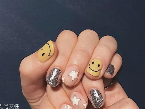 大大的一个卡通笑脸,星星更是增加了童趣性,搭配银色细闪甲油带来一些独特的个性。