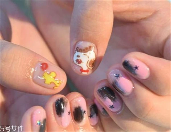 史努比与糊涂塌客作为这款美甲的亮点,粉色和黑色甲油做出晕染款式,两个卡通形象真是让人挪不开眼呢。