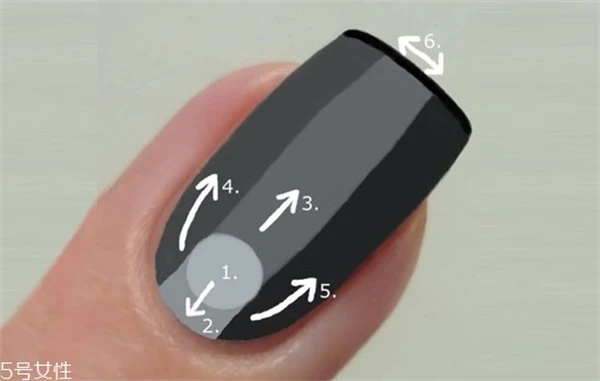 步骤二:沾取指甲油在指甲月牙处点一滴。以此为中心,往下推一笔直至留下一个小空隙。