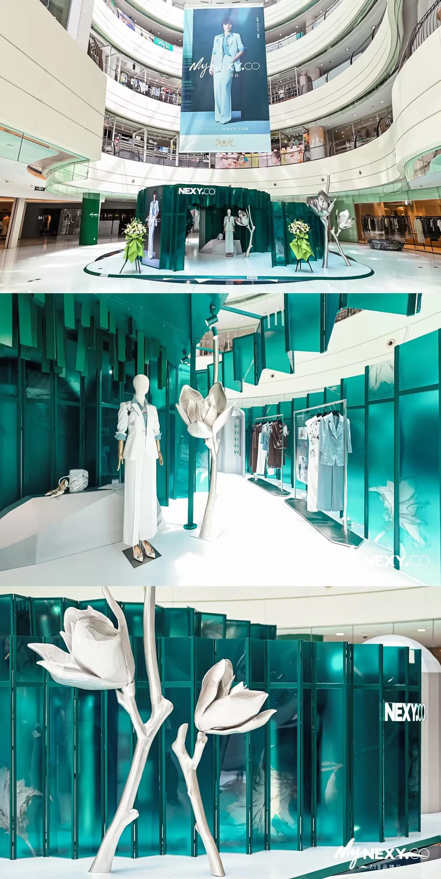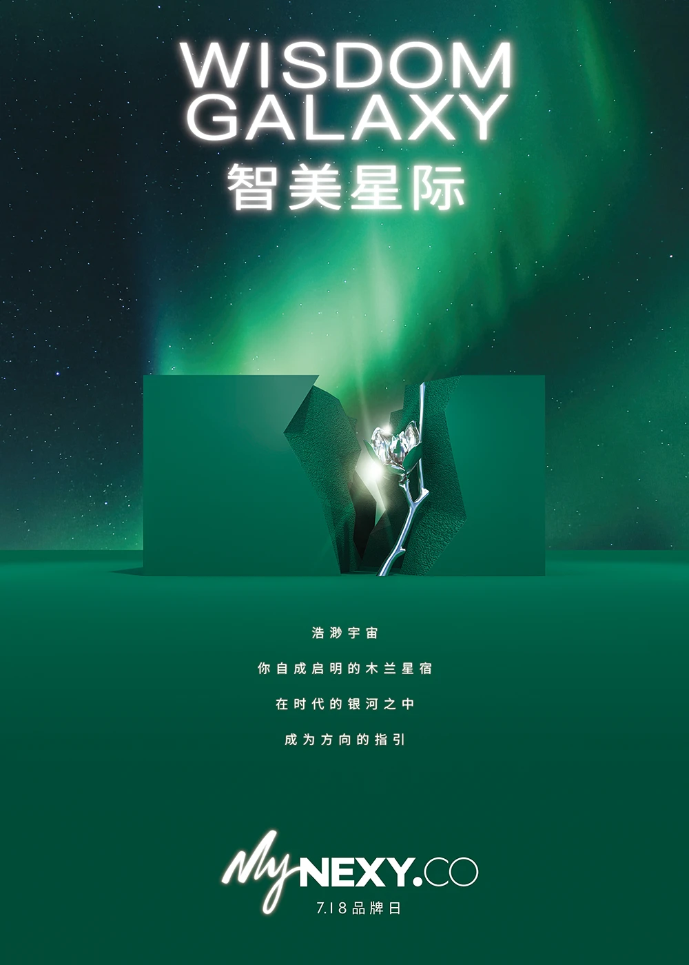 NEXY.CO(奈蔻)以品牌色奈蔻绿为基调,通过具有未来感的通透材质在线下都会中打造一道绿色光芒,仿佛在星际中自由流动的极光。巨型木兰花昂扬绽放,如浩渺宇宙星河中一颗指引方向的恒星。这座名为《智美星际》的主题快闪在上海久光百货、西安赛格国际购物中心相继着陆。邀您身临其境,探寻星际穹顶的神秘引力,星际万花筒的斑斓乐趣。
