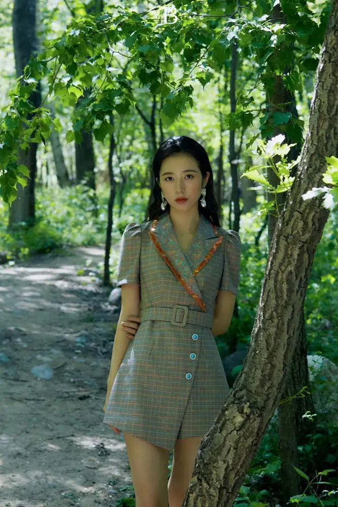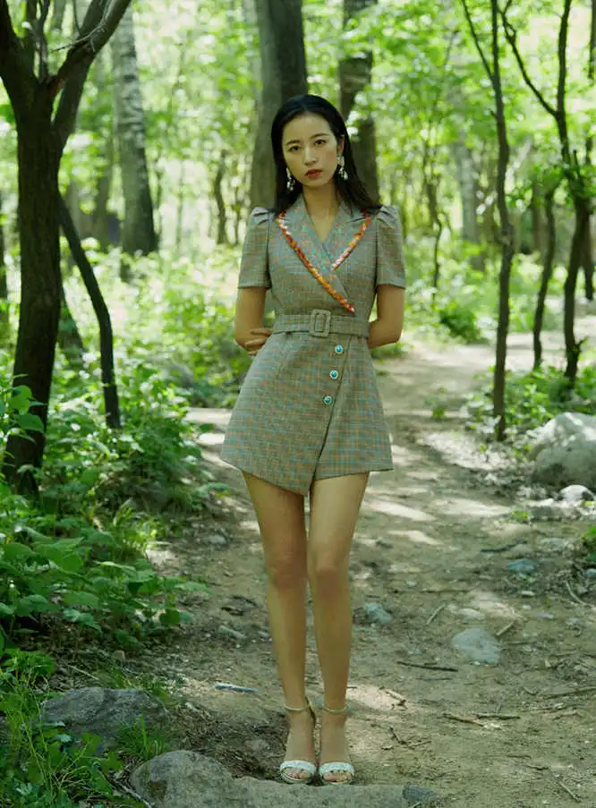 进入大自然,感受绿意的疗愈。绿叶树荫散发着生命力的味道,平静的感觉毫无预兆地涌入心头。周雨彤身穿MAXRIENY 2020夏季西装连体裤,在树影林间,就像如精灵一样释放着自然灵气。