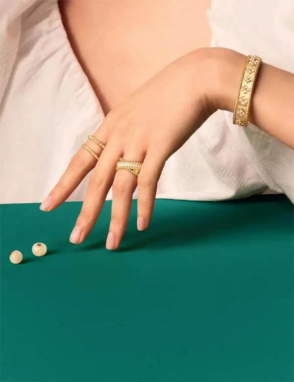 戒指叠戴看似简单,实则蕴含着丰富的搭配技巧。它是一种看似随意却充满规律的时尚表达方式。戒指的叠戴可以通过相似的设计元素、风格或纹理来实现,展现出佩戴者的独特品位。无论是复古花纹、扭条风格,还是串珠设计,戒指叠戴都能在细节之处展现出精致与优雅。通过巧妙的组合,戒指叠戴可以成为手指上的时尚焦点,为整体造型增添别样的韵味。