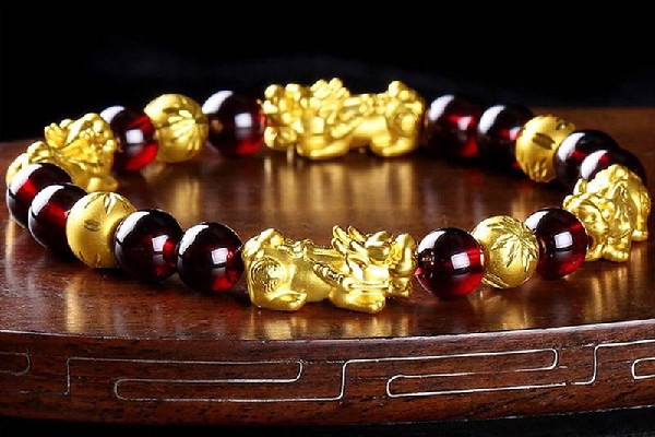 4、石榴石配黄金转运珠一颗就已经合适了。可以是颗转运桶珠,旁边搭配几颗小金珠,既好看又大方,这样在手臂上方可以显示一颗转运珠,旁边有几颗小金珠做搭配。