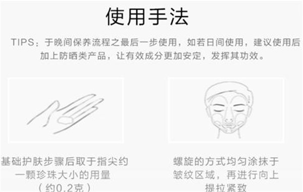 每天作为晚上护肤步骤最后一步使用,取一粒小珍珠份量(约0.2g)均匀涂抹在眼部周围。眼部在意的部位进行重点的涂抹以及配合按摩手法。