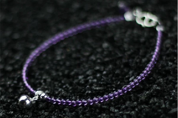 二、天然形成的紫水晶往往会展现出色带,而若是人工合成的紫水晶则不会有色带出现。仔细的观察一条天然的紫水晶手链晶体通透、裂缝很少,但是仍可以看到明显的色带。合成的紫水晶便没有这种特点,而且合成的紫水晶颜色非常的单一,不灵活。