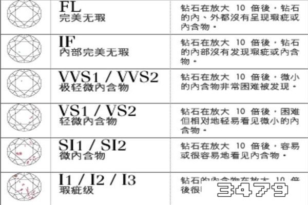3、净度(clarity):钻石净度等级依次为FL,IF,VVS1,VVS2,VS1, VS2, SI1, SI2, I1, I2, I3。钻石净度的FL等级最高,I3等级最低,分别代表的含义如下所示: