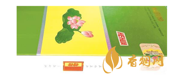 假烟:荷花的花瓣和荷叶大多是印上去的,对比真烟图案整体视觉效果明显粗糙,荷花的花瓣色泽暗淡,勾勒花瓣的金边漏空不贴合,勾勒荷叶的线条不清晰且是虚线。