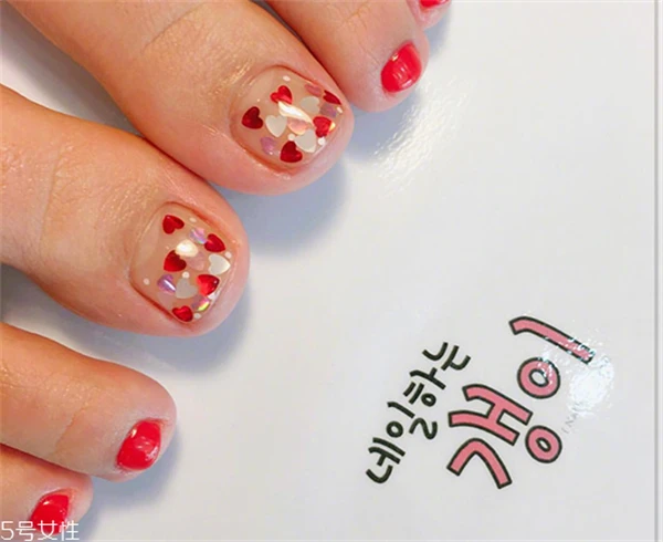 西瓜红色为基础色,显白。搭配上爱心闪片作为渐变法式款,精致亮眼。